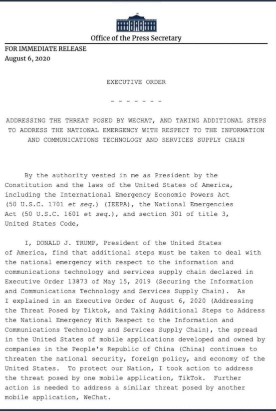 北京时间8月7日上午,特朗普签署行政命令:45天后禁止美国公司与字节跳动及微信之间的任何交易。