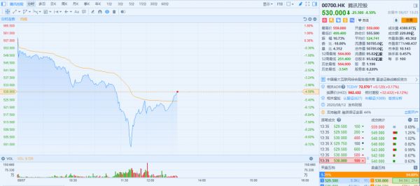 截至7日午间休市,腾讯控股的股价跌幅已收窄至6.75%。上午的股价走势显示,有投资者在股价到达500元的时间点选择抄底,走势呈现V字形反弹。