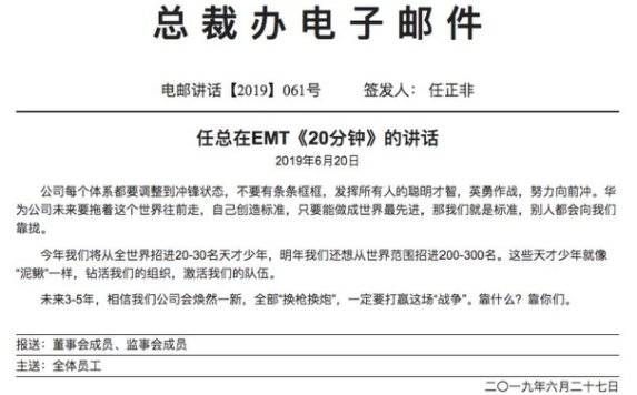 在去年6月的华为EMT(经营管理团队)内部讲话中,任正非表示,“今年(2019年)我们将从全世界招20-30名天才少年,明年我们还想从世界范围招进200-300名。这些天才少年就像‘泥鳅’一样,钻活我们的组织,激活我们的队伍。”