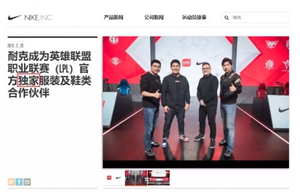 今年2月底,腾竞体育与耐克中国在上海举办发布会,宣布LPL与耐克达成为期4年的深度战略合作。这被行业人士认为是中国电子竞技取得了一次典型性胜利,这也是目前已知的电子竞技联赛与运动品牌展开的最长期的深入合作。