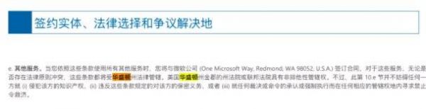 “当您依照这些条款使用所有其他服务时,您将与微软公司 (One Microsoft Way, Redmond, WA 98052, U.S.A.) 签订合同,对于这些服务,无论是否存在法律原则冲突,这些条款都将受华盛顿州法律管辖。美国华盛顿州金郡的州法院或联邦法院具有非排他性管辖权。”