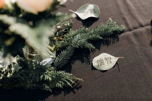 宾客用餐时的擦嘴巾和杯垫,是新娘用干净的布一针一针制成的小手帕;宾客的位置牌,是用废弃的尤加利叶子书写的。