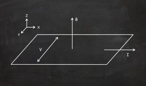 经典霍尔效应是带电粒子在磁场中运动所造成的简单结果:当导体上有一个沿x-方向的恒定电流(I),z-方向存在恒定磁场(B),那么在y-方向上将产生电压(V)。