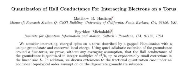 然而,数学家似乎并不能满足于索利斯等人对量子霍尔效应做出的解释。对于数学家来说,其背后的机制仍属于未解之谜。2015年,加州理工学院的数学家斯皮里宗·米哈拉基斯(Spyridon Michalakis)和微软的物理学家马修·海斯廷斯(Matthew Hastings)发表了一项为严格的数学证明。他们从2008年开始一同研究这一问题,其最终解决方案同样是基于数学中的拓扑学。