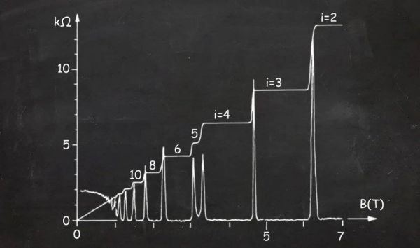 1980年,德国物理学家克劳斯·冯·克利青(Klaus von Klitzing)在进行一项实验。他将原子级厚的晶体材料于低温下暴露在强磁场中,发现随着磁场强度的增加,金属电导的增加并不像经典物理学所预测的那样平滑地渐进增长,而是呈量子化的逐阶上升。