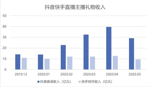 根据Questmobile,2020年上半年直播主播礼物收入分布中,抖音主播音浪收入共计152亿元,2月起,直播主播数量、直播场次不断增加,主播礼物收入也不断增加,2月同比增长63%;而快手主播快币收入共计67亿元,整体收入趋于稳定。