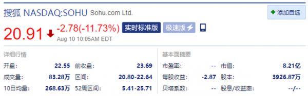 新浪科技讯 8月10日晚间消息,搜狐跌超11%,财报显示,搜狐第二季度亏损8000万美元。