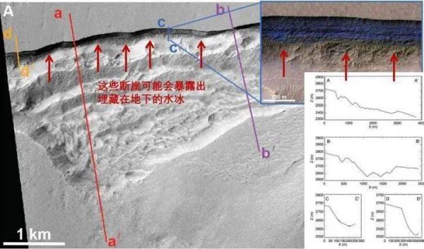 断崖形态示例,aa'、bb'、cc'和dd'对应于右下的四副高程剖面图,表明断崖位于塌陷和滑坡的高处(后缘)。右上是断崖部分在HiRISE的色彩加强影像中显示出的色调差异(图片来源:参考文献8)
