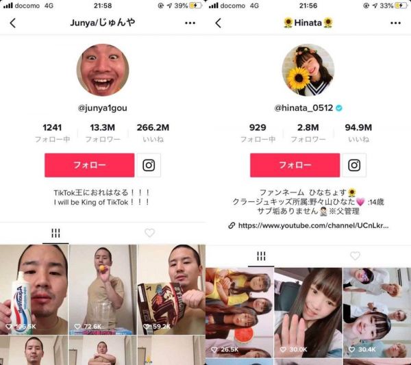 根据TikTok的数据网,日本目前粉丝最多的账号是草根出身的junya1gou,有1330万粉丝,每天还在以10万+的速度涨粉,主要以无脑沙雕视频为主,比如最新的那一个就是用牙膏来洗脸,配以很夸张的反应,7个小时就有10万+点赞。而14岁的小女孩hinata_0512有280万粉丝,走的是卡哇伊的风格,配着BGM做一些可爱的动作。已经被日本最大的儿童经纪公司クラージュキッズ签约。