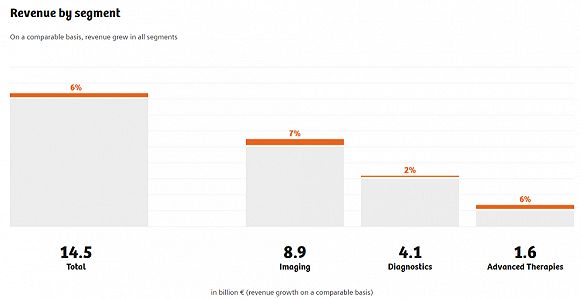 影像诊断是"GPS"三巨头的传统优势业务,从去年的财报上来看,西门子医疗的影像诊断业务仍然占据核心优势,获得89亿欧元的营收;体外诊断板块营收次之,约为41亿欧元,西门子医疗在过往十余年间收购德普诊断、德灵诊断和拜耳集团的诊断业务,补强了这项业务;而临床治疗这个板块,在西门子医疗的业务体系中相对较弱,去年仅有16亿欧元的收入,这也是西门子医疗想要发力补足的板块。