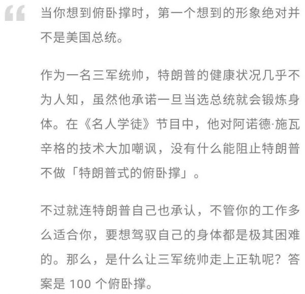 此前就有一款可以撰写假新闻的AI,叫Grover,它可以针对任何主题写一些天马行空的假新闻,比如围绕争议人物特朗普写的《为什么特朗普一天要做100个俯卧撑》的怪诞文章。看起来颇像那么回事: