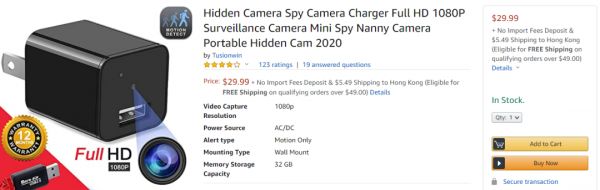 在亚马逊上搜索“隐藏摄像头”,系统可以给出成千上万个嵌入了微型相机的日常物品,这些产品中的价格大多也都在100美元以下。