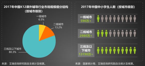据艾瑞咨询数据显示,三线及以下城市1.3亿中小学生带来的市场规模为80.3%,二线城市为13.2%,而一线城市仅为6.5%。