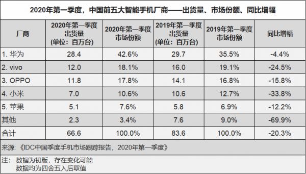 根据第三方数据公司IDC发布的手机季度跟踪报告显示,2020年第一季度中国前五大智能手机厂商中,华为出货量达到2840万台,占据42.6%的市场份额,其次是vivo、OPPO,各自占据国内市场18.1%和17.8%的市场份额。