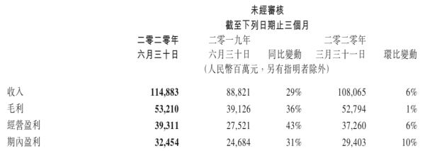 腾讯2020年第二季度部分主要财务数据