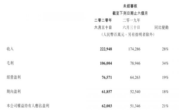 腾讯2020年上半年部分主要财务数据