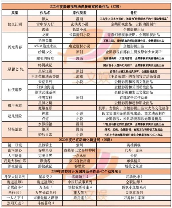 比如,8.8日腾讯视频动漫公布的60+部项目片单。《镖人》《龙族》,以及王者荣耀动画番剧等IP的动画化项目将在腾讯视频独播。而“斗罗大陆”“魔道祖师”“武动乾坤”“斗破苍穹”等IP的动漫项目也将持续开发。