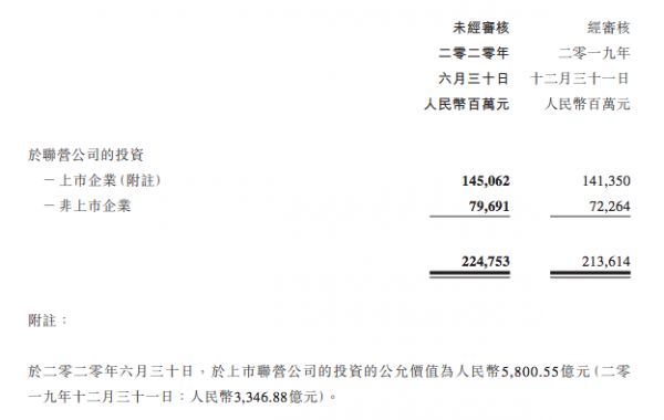 于2020年6月30日,腾讯在上市联营公司的投资的公允价值为人民币5800.55亿元;半年前的2019年12月21日,这个数字是3346.88亿元(联营公司指腾讯对其经营管理有重大影响力的公司,持股一般在20-50%之间)。