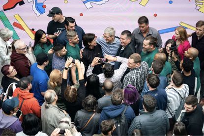 2019年,库克在华盛顿新装修的卡内基图书馆苹果店内与顾客打招呼