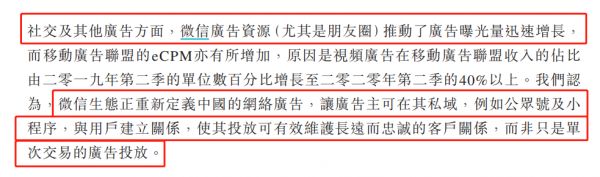 互联网行业里常说的一句粗话,羊毛出在猪身上——相反,当一个生态足够丰富多元的时候,两个节点之间形成闭环,可能会带来第三方的意外获益。当微信的社交属性与小程序的商业功能形成闭环之后,意外获利的是腾讯的广告业务。
