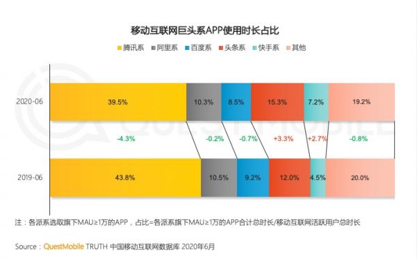据QuestMobile数据,截至2020年6月,腾讯系APP用户使用时长在全网占比从2019年6月的43.8%降为39.5%,虽然仍位列所有巨头公司第一,但这个数字的巅峰是2017年的54.3%。相比而言,头条系和快手系的增幅依然非常明显。