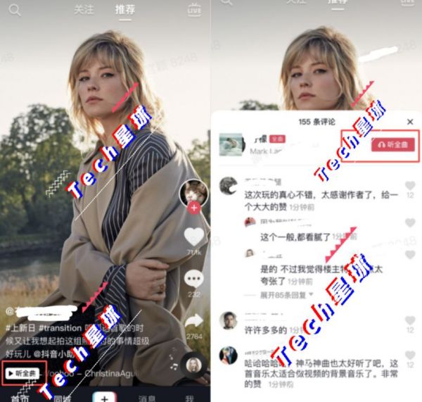 Tech星球(微信ID:tech618)体验后发现,抖音此次增加的“听全曲”的功能放在了短视频界面的原创音乐旁,还有用户评论的最上方,以及该曲目的介绍页面中。