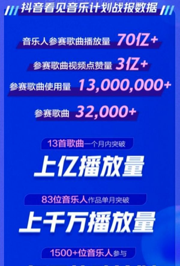 2020年,升级了“抖音音乐人亿元补贴计划”,针对全体音乐人正式开放。开启一个月,深受音乐人和歌迷的欢迎,根据抖音官方宣布的数据显示,音乐人参赛歌曲播放量达到70亿以上,参赛歌曲视频点赞量突破3亿,参赛歌曲超过3万首,并且有13首歌在一个月内突破上亿播放量。