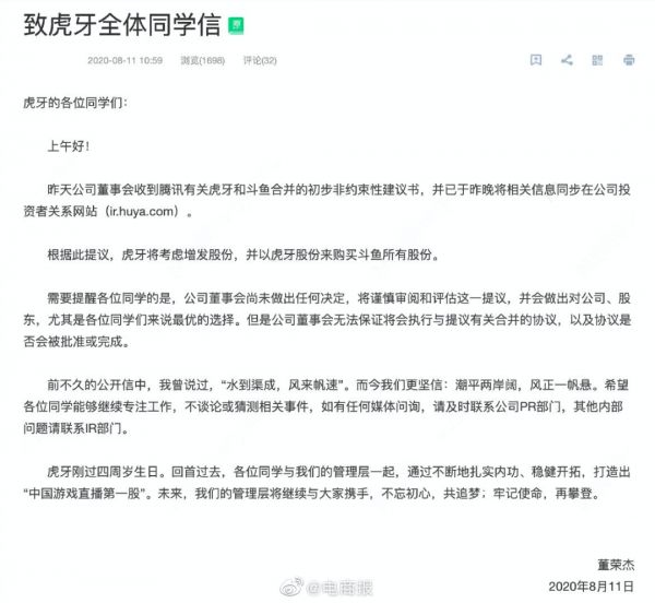 8月10日,腾讯正式发出关于斗鱼与虎牙战略合并的初步无约束力提案。在11日,虎牙CEO董荣杰在对内发布公开信称:公司董事会尚未做出任何决定,将谨慎审阅和评估这一提议。斗鱼创始人陈少杰也在当天晚间举行的2020年Q2财报分析师会议中回应称,目前刚刚收到腾讯的邀约,还没有来得及评估,也没有做出具体决定。