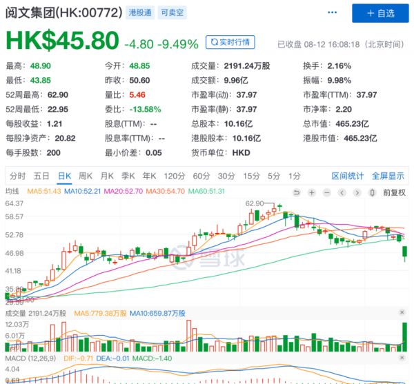 这是阅文多年来首次迎来亏损,还是巨亏。财报发出后阅文股价应声大跌,截至8月12日收盘报45.8港元/股,较前日大跌9.49%,市值蒸发近50亿港元,折合人民币超过43亿元。