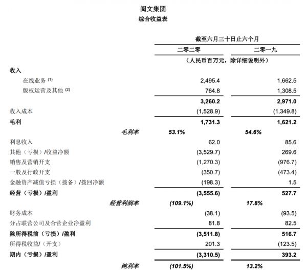 为了显示客观,腾讯将这种失望的情绪,直接用数字语言写在了阅文这半年的财报里。