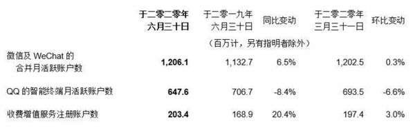 在用户数据方面,腾讯微信及WeChat的月活跃帐户12.1亿,QQ的智能終端月活跃账户数6.47亿,去年7.07亿,同比下降8.4%。