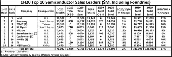 2020年上半年全球十大半导体厂商销售排名 图片来源:IC Insights官网