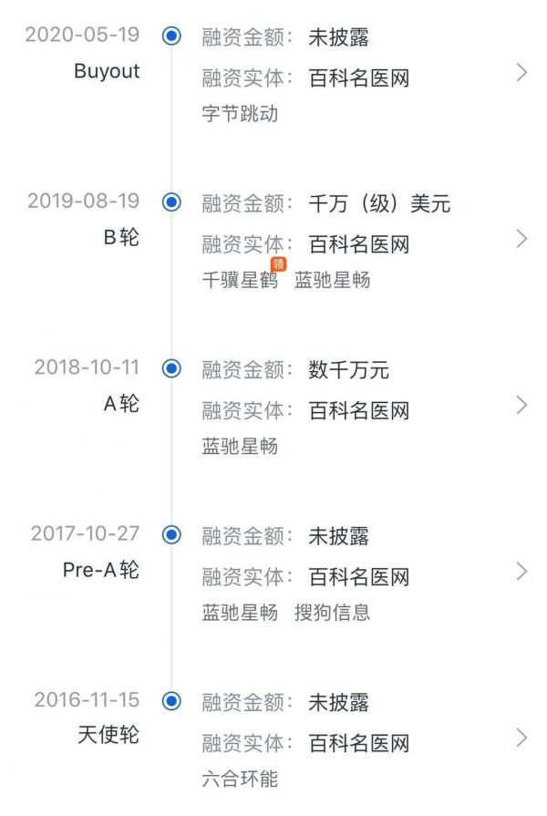 根据CVSource投中数据显示,被头条收购前,百科名医网已完成四轮融资,包括2019年8月千骥星鹤领投、蓝驰创投跟投的千万美元级B轮融资,以及2018年10月蓝驰创投领投,搜狗参投的数千万元A轮融资。