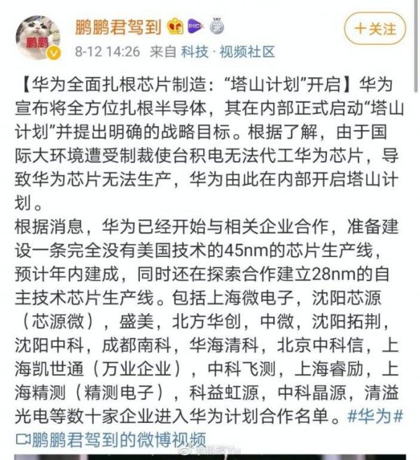 昨日下午,微博大V“鹏鹏君驾到”在微博爆料,华为正在内部启动“塔山计划”,预计年内与相关企业合作建成一条完全没有美国技术的45nm芯片生产线,同时探索28nm自主技术芯片生产线。