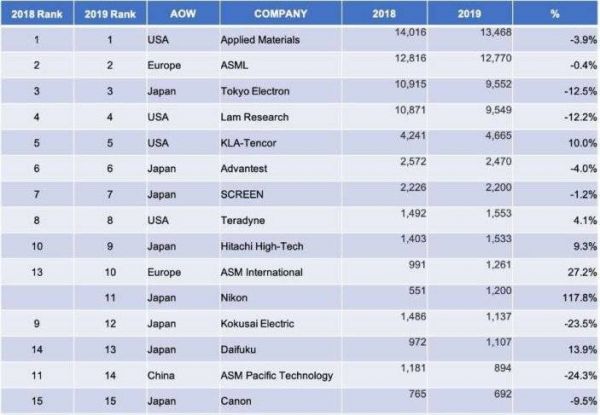 2019年用于IC的半导体生产设备Top15排名