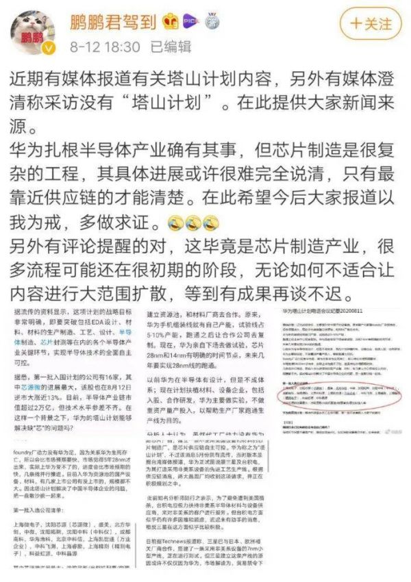 目前在博主“鹏鹏君驾到”的微博主页已经看不见这条微博,昨晚六点半其发微博表示,“华为扎根半导体确有其事,但芯片制造是很复杂的工程,具体进展或许很难完全说清,只有最靠近供应链的才能最清楚。”