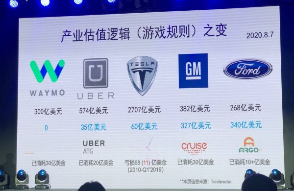 我们都说,华尔街往往最能够敏感嗅到行业变局中的机会。上图灰色的部分是Waymo、Uber、特斯拉、GM、Ford这五家公司在今年8月份的市值或估值,蓝色的数字是它们2020年第一季度的营收。特斯拉的市值相当于去年同期的好几倍,其他几家的市值或估值都有不同程度的降低。Waymo是做自动驾驶最好的,其他公司也有很强的团队在做。为什么特斯拉可以脱颖而出?