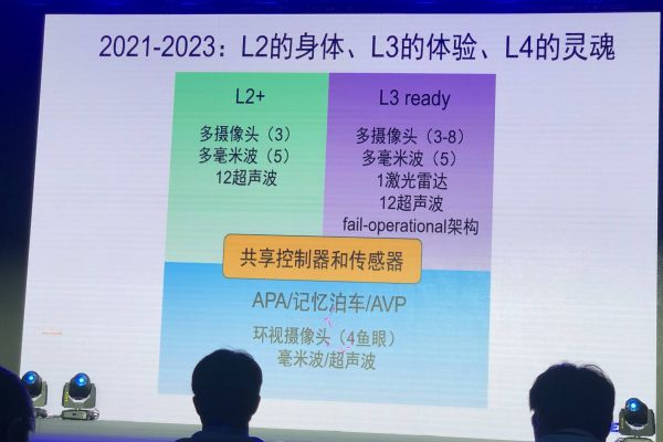 “2021年-2023年期间会出现这样的车型,它是L2的身体,但有接近L3的体验,并有L4的灵魂,AVP、APA和记忆泊车都是L4的灵魂,可以跑影子模式,可以在后台跑L4的算法。”吴甘沙表示。