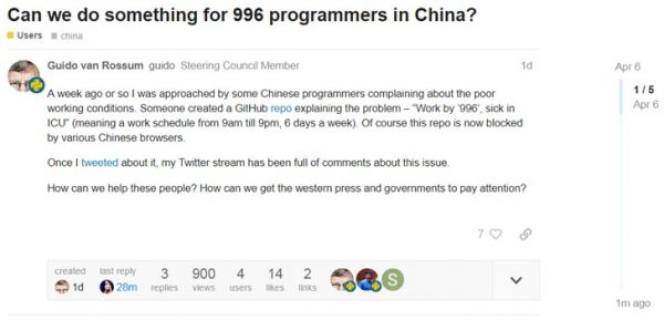 吉多·范罗苏姆此前在Python官方论坛中发表了一篇“我们能为中国‘996’程序员做些什么?怎样才能能引起西方媒体和政府的关注?”的帖子,CPython核心开发者森迪尔认为,范罗苏姆这一举动充满善意,对社区是激励也是帮助,身为领导做出了很好的榜样。