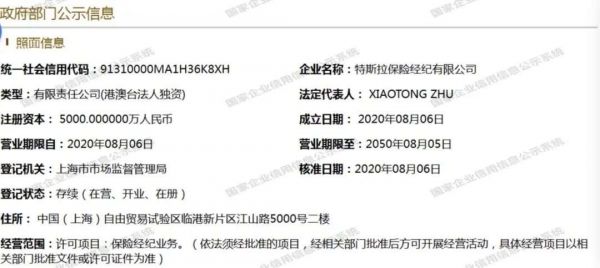 国家企业信用信息公示系统显示,特斯拉在8月6日成立“特斯拉保险经纪有限公司”,注册资本5000万元,法定代表人、董事长兼总经理均是特斯拉全球副总裁、大中华区负责人朱晓彤。