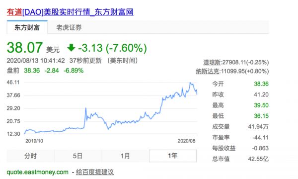 网易教育是网易第一个独立上市的业务,于去年10月25日登陆美股,股价从开盘的12.5美元涨到截止今日的38美元,用时不到一年。