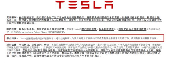 特斯拉在购买协议中表明“禁止转卖”