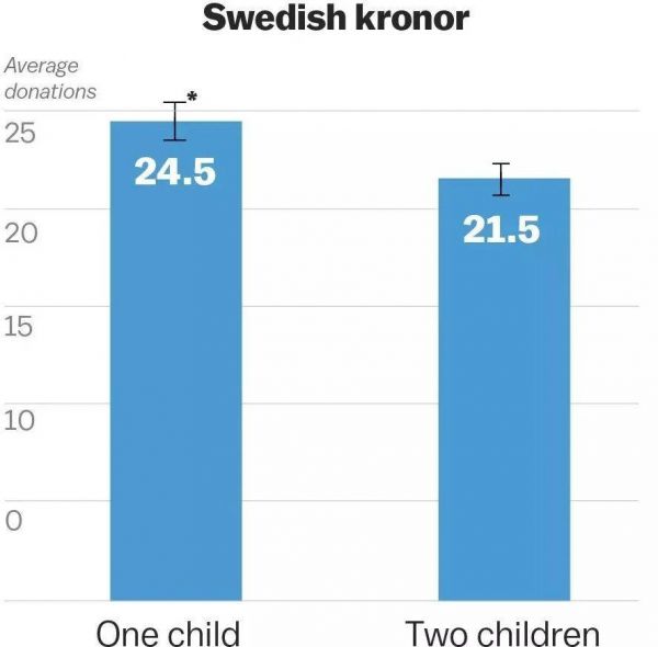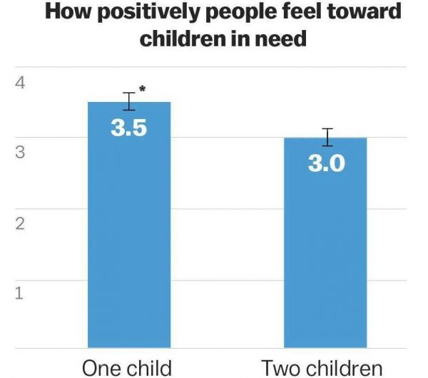 斯洛维奇最近的一项研究非常有力地证明了这一点。实验中,斯洛维奇和同事询问参与者是否愿意为需要帮助的孩子捐款。当实验中的需要帮助的孩子数量从一变成二时,研究人员发现,参与者对孩子的同情心减少了,捐款也减少了。