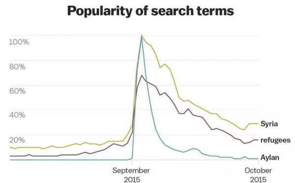 叙利亚、难民等关键词搜索在一个月内暴涨(来源:Google Trends/PNAS)