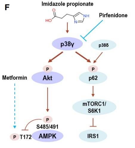 其实此前研究者还发现过丙酸咪唑的另外一条作用通路,也是通过p38γ实现的,不过最后这条通路是落实在了胰岛素受体底物1(IRS1)上,直接影响了胰岛素敏感性。