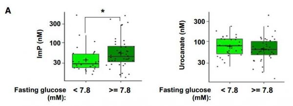 研究者首先调查了一番那些治疗效果不理想的2型糖尿病患者。以血糖水平7.8mM为分界线,经过二甲双胍治疗血糖仍然较高的患者体内,比血糖较低的患者体内丙酸咪唑水平要更高。不过两组中,丙酸咪唑的前体物质尿烷酸酯的水平是差不多的。