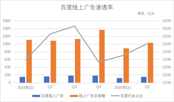 迄今为止,百度虽然在线广告的行业渗透率有所提高,但与寡头间的差距也在放大,以腾讯为例,2019年Q3,腾讯以1亿元的微弱优势首次超过百度核心的广告收入,但到2020年Q2,双方差距已达到40.6亿元。