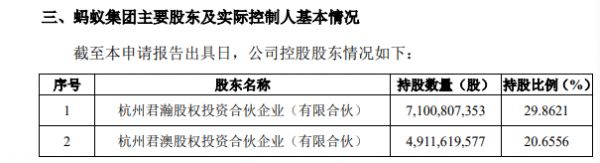 文件还披露了蚂蚁集团的主要股东,截止该份文件出具日,其控股股东包括:杭州君瀚股权投资合伙企业(有限合伙)、杭州君澳股权投资合伙企业(有限合伙),持股比例分别为29.8621%、20.6556%。