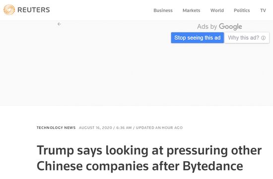 报道说,特朗普在记者会上被问到,会不会向包括阿里巴巴在内的其他中国企业施加禁令,特朗普回答:“嗯,我们在考虑事项,没错。”路透社据此得出了报道标题,“特朗普说,在字节跳动之后正考虑向其他中国企业施压”。