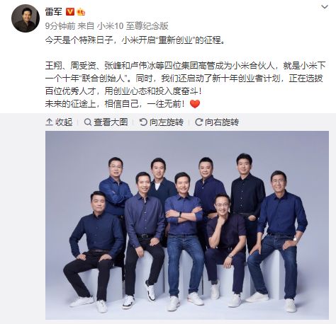 王翔、周受资、张峰和卢伟冰等四位集团高管成为小米合伙人,就是小米下一个十年“联合创始人”。同时,我们还启动了新十年创业者计划,正在选拔百位优秀人才,用创业心态和投入度奋斗!
